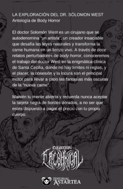La exploración del Dr. Sólomon West es una antología de doce cuentos de Body horror que compila a los autores: Ángel Isián, Andrea Ciria, Ariel S. Tenorio, Carlos Enrique Saldivar, Connie Tapia Monroy, Cristina Mars, Flor Canosa, Fraterno Dracon Saccis, José Ángel Conde, Israel Montalvo, Lou W. Morrison y Poldark Mego. Con creaciones inimaginables que superan la ficción, West redefine los límites de la modificación corporal y hace realidad las fantasías más perturbadoras, donde la carne se convierte en un lienzo vivo.